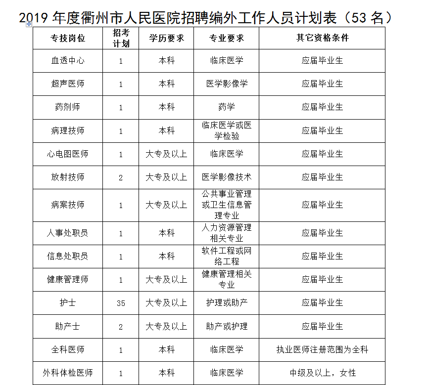 附件一:2019年度衢州市人民医院招聘编外工作人员计划表