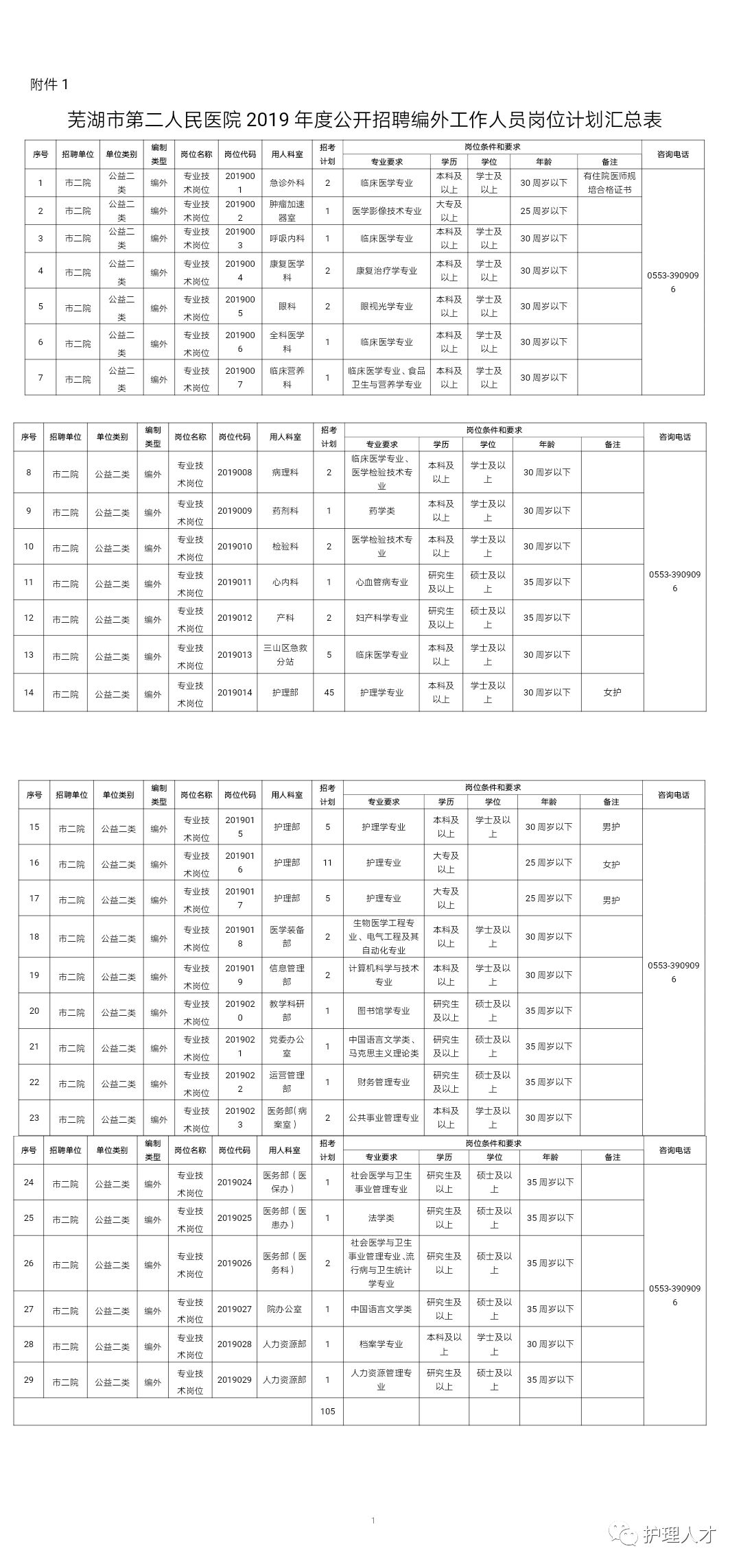 2019年计划招聘编外工作人员105名,详见《2019年芜湖市第二人民医院公开招聘编外工作人员岗位表》(附件1),下称《岗位表》。