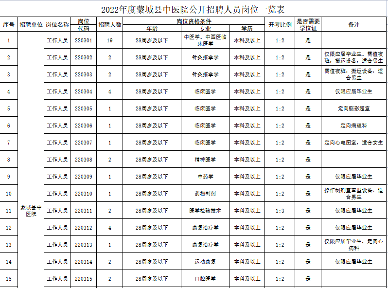 为满足蒙城县县级公立医院发展需求,根据《事业单位人事管理条例》(国务院令第652号)、中共安徽省委组织部、安徽省人力资源社会保障厅《关于印发〈安徽省事业单位公开招聘人员暂行办法〉的通知》(皖人社发〔2010〕78号)规定和要求,现将2022年度蒙城县县级公立医院公开招聘工作人员有关事项公告如下: